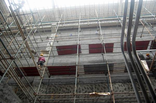 京溪污水工程系全地下施工,土建還有許多工作要同時做,拆摸、拆支撐架、拆臨時混凝土柱、砌墻、裝飾等,安裝在此交叉施工環(huán)境中進行,噪音、灰塵、潮濕、陰暗、悶熱、不通風、空間狹小。同時,交叉點多,安全要求高。只要有一個工作面,除了我們和土建,還有其他單位人員也要同時進行,消防、照明、通風、起重等,兩層地下室,每一層8-10米高,還有小型運料車輛進入。里面全是人,腳手架、孔洞,安全要求太大。而且,材料、設備搬運、吊裝困難。只有一個進出口,大的設備、材料要從吊裝口吊入,再通過自己因勢利導想的現(xiàn)場辦法才能運、移、吊裝到位。在里面吊車不能進,柱、梁也多,全靠人。有時一臺設備吊進去搬運安裝到位得要2天。