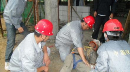 8:24最近的管理人員(模擬人員尹建軍、徐曉毛)盡快趕到出事地點,對出事情況作出初步判斷,觀察出事地點及原因,確保事后現場的安全工作,做好事故現場警戒工作,疏散圍觀群眾。他們再次撥打負責人電話,說明現場情況,請求支援。現場負責人接到電話后立即通知應急預案小組各有關人員,準備救援物資,即刻前往事故地點。
