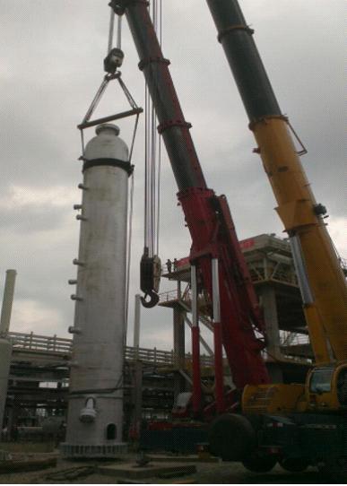 這樣的笑容來之不易。3臺反應(yīng)器,最高的有19米多,單臺重量最大達到141余噸??偘鼏挝辉谠O(shè)計的時候未考慮吊耳。由于材質(zhì)特殊,也無法在設(shè)備上施焊增加吊耳,這是最棘手的??偘鼏挝皇譄o策,但又不同意項目部提出采用鋼絲繩捆綁式的吊裝方案,猶豫著不愿意簽字,萬一有個失誤,后果不堪設(shè)想!為了這次吊裝,江蘇分公司給予了大力支持,派出了經(jīng)驗豐富的起重吊裝專業(yè)工程師,多次到現(xiàn)場、到基地與總包單位反復(fù)論證方案的可行性。激烈的討論、嚴(yán)謹(jǐn)?shù)挠嬎?、類似業(yè)績的展示……一次又一次的努力,項目部滿滿的信心和十足的把握最終讓總包單位同意了這個方案。