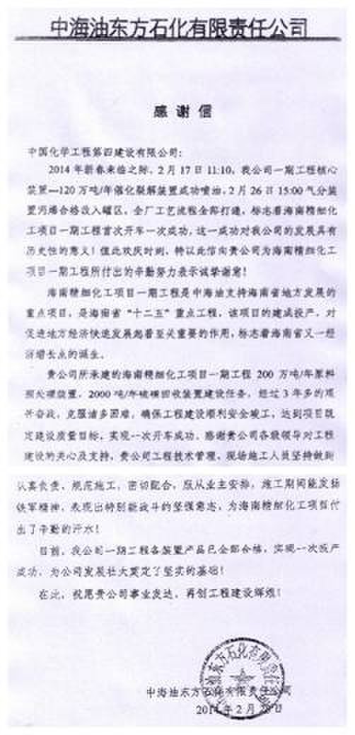 自2010年8月11日開工以來,項(xiàng)目部在分公司經(jīng)理陳文彬、項(xiàng)目經(jīng)理劉興陽(yáng)的領(lǐng)導(dǎo)下,艱苦奮戰(zhàn)、精心組織、精細(xì)管理,工程整體形象良好、工程建設(shè)程序規(guī)范、質(zhì)量控制到位,于2013年9月28日按期順利實(shí)現(xiàn)機(jī)械竣工。通過投料試車,該項(xiàng)目達(dá)到一次試車成功、生產(chǎn)出合格產(chǎn)品的良好效果,受到了中海油東方石化有限責(zé)任公司的來信稱贊。