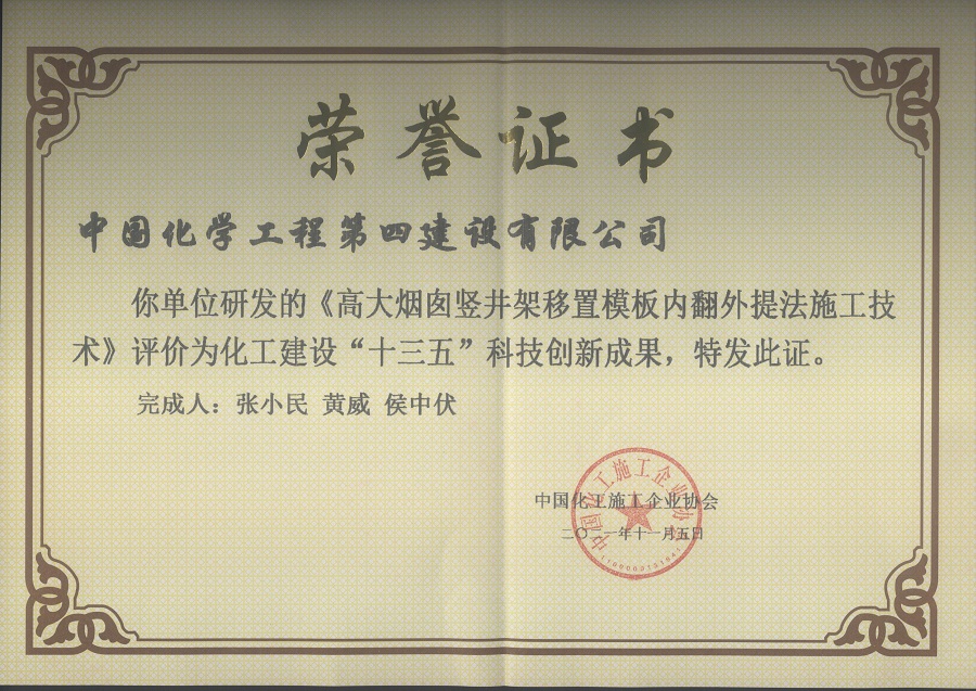 7月25日,從化工協(xié)會十屆三次會員代表大會暨科技創(chuàng)新大會傳來喜訊,公司榮獲兩項化工建設(shè)“十三五”科技創(chuàng)新成果獎,分別為華南公司完成的高大煙囪豎井架移置模板內(nèi)翻外提法施工技術(shù)和華東公司完成的超高煤氣化框架鋼結(jié)構(gòu)模塊化安裝技術(shù)。