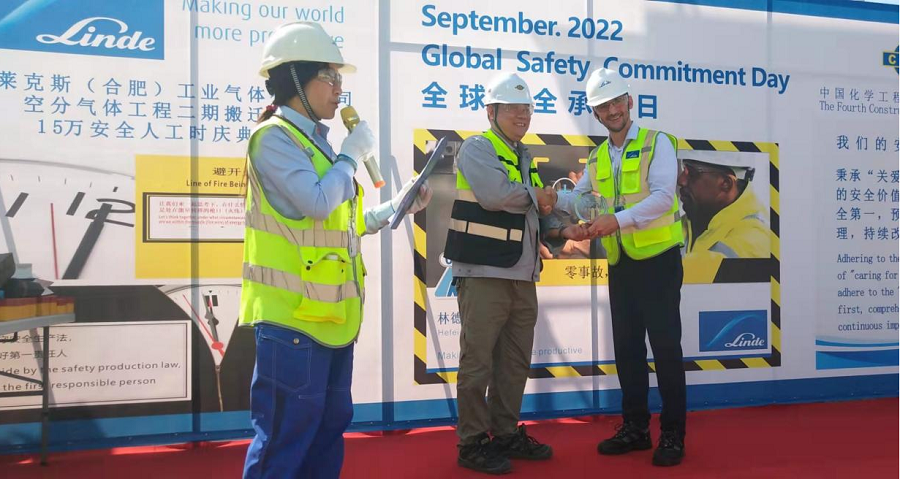 在慶典上,林德安全經(jīng)理姚文杰及施工經(jīng)理黃金輝介紹項(xiàng)目自開工以來(lái)的安全情況,對(duì)合肥項(xiàng)目按時(shí)完成了PL4空分各套裝置吊裝安裝、循環(huán)水塔及35千伏變電站送電、項(xiàng)目95%尾項(xiàng)完善的三大重要節(jié)點(diǎn),實(shí)現(xiàn)了15萬(wàn)安全人工時(shí)的成績(jī)表示慶賀。羅伯特向項(xiàng)目經(jīng)理仇斌頒發(fā)優(yōu)秀項(xiàng)目經(jīng)理獎(jiǎng),并表彰了現(xiàn)場(chǎng)安全之星。(通訊員 周愛純 吳超)