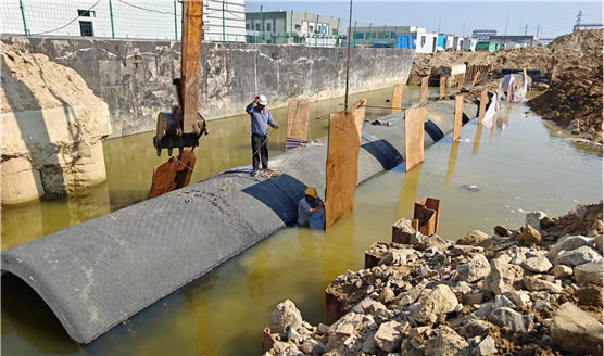 該雨水管道施工區(qū)域位于水下,管中線離海水僅有20米并與海相通,管道安裝難度大;同時,在開挖過程中,取水箱涵上面出現大量海水涌入導致土層坍塌。面對緊急情況,項目部連夜探討解決管道水中定位與對接問題,積極會商業(yè)主、監(jiān)理單位,積極探索解決問題的路徑和方法,最后決定因“水”制宜,采取水下澆注混凝土來解決此難點。施工人員在箱涵上方處,通過對預應力鋼筒混凝土管兩端頭進行預制管枕施工,淤泥層及碎石處采取預制閥板墊層,挖集水坑進行強排,并且全程用GPS和全站儀進行精確測量標高和定位,確保雨水管道安裝的準確性和穩(wěn)定性,順利完成管道水中施工作業(yè)。