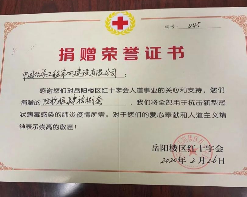 自新冠肺炎疫情發生以來,公司在積極抓好疫情防控和復工復產工作的同時,切實履行社會責任,多方捐贈防疫物資,馳援防控一線。2月26日,公司向岳陽市岳陽樓區紅十字會捐贈防護服48套,專項用于支援岳陽樓區新冠肺炎疫情防控。這也是公司在抗擊新冠肺炎疫情的關鍵時刻,再次向社會捐贈防疫物資。岳陽樓區紅十字會代表在公司基地接受捐贈,對公司的愛心捐贈表達了誠摯的謝意,并向公司發放捐贈證書。